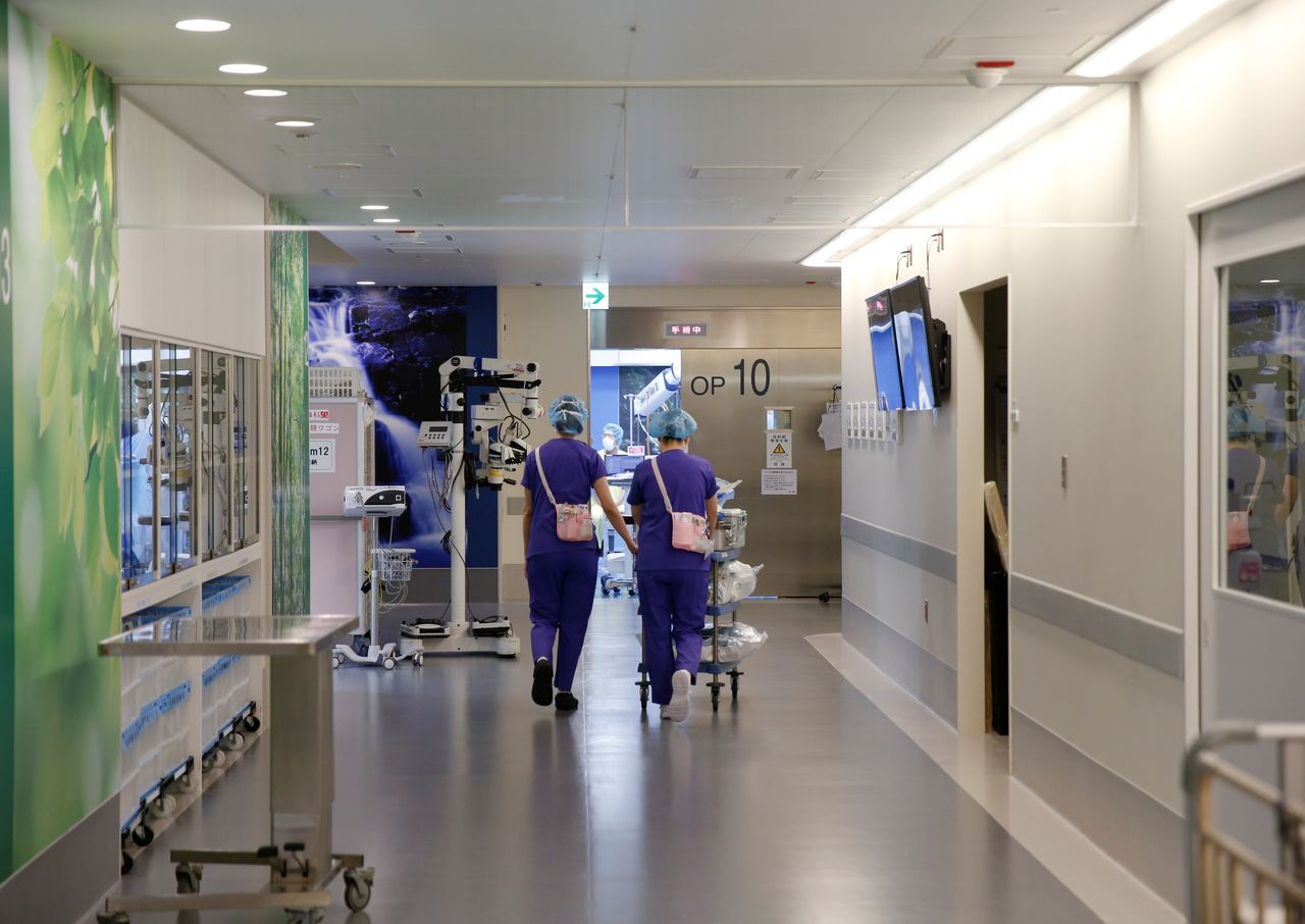 الطواقم الطبية في مستشفى أوساكا الطبي والصيدلاني الجامعي تعمل في جناح العمليات بالمستشفى خلال تفشي مرض فيروس كورونا الجديد (كوفيد-19) في تاكاتسوكي بمحافظة أوساكا في اليابان، 17 مايو/ أيار 2021. أكيرا توموشيغي/ رويترز.