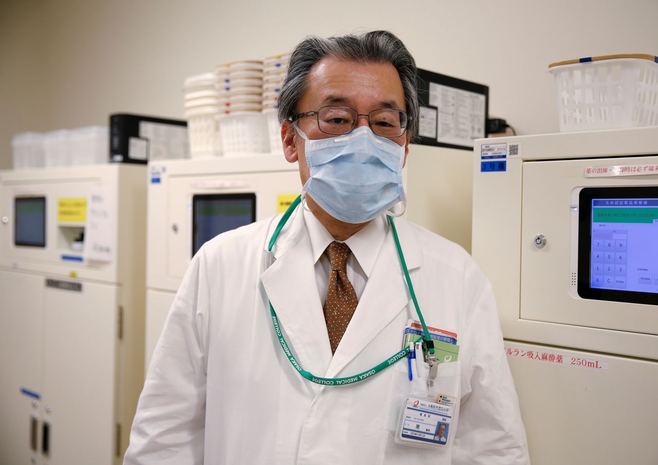الدكتور توشياكي مينامي مدير مستشفى أوساكا الطبي والصيدلاني الجامعي يقف لالتقاط صورة في مخزن للأدوية بالمستشفى خلال تفشي مرض فيروس كورونا الجديد (كوفيد-19) في تاكاتسوكي بمحافظة أوساكا في اليابان، 17 مايو/ أيار 2021. أكيرا توموشيغي/ رويترز.