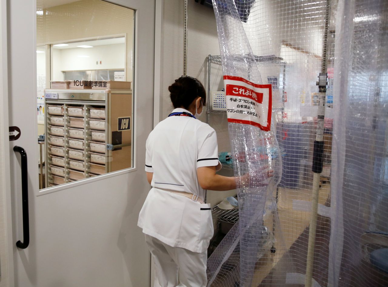 واحدة من الطاقم الطبي في مستشفى أوساكا الطبي والصيدلاني الجامعي تدخل وحدة العناية المركزة (ICU) خلال تفشي مرض فيروس كورونا الجديد (كوفيد-19) في تاكاتسوكي بمحافظة أوساكا في اليابان، 17 مايو/ أيار 2021. أكيرا توموشيغي/ رويترز.