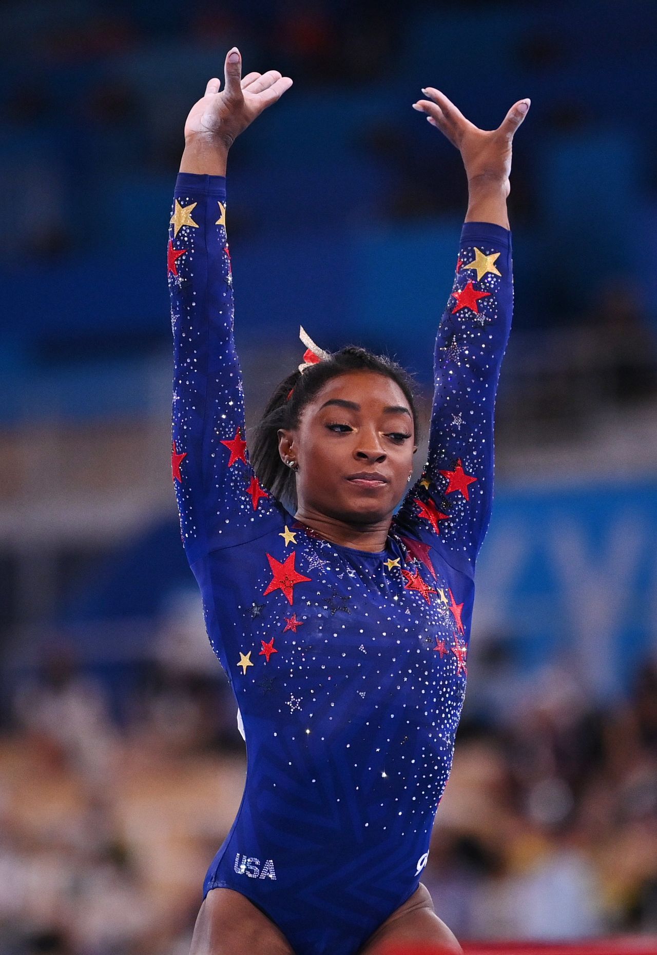 لاعبة الجمباز الأمريكية سيمون بايلز تستعد لإحدى المنافسات في أولمبياد طوكيو يوم الأحد. تصوير ديلان مارتينيز - رويترز.
