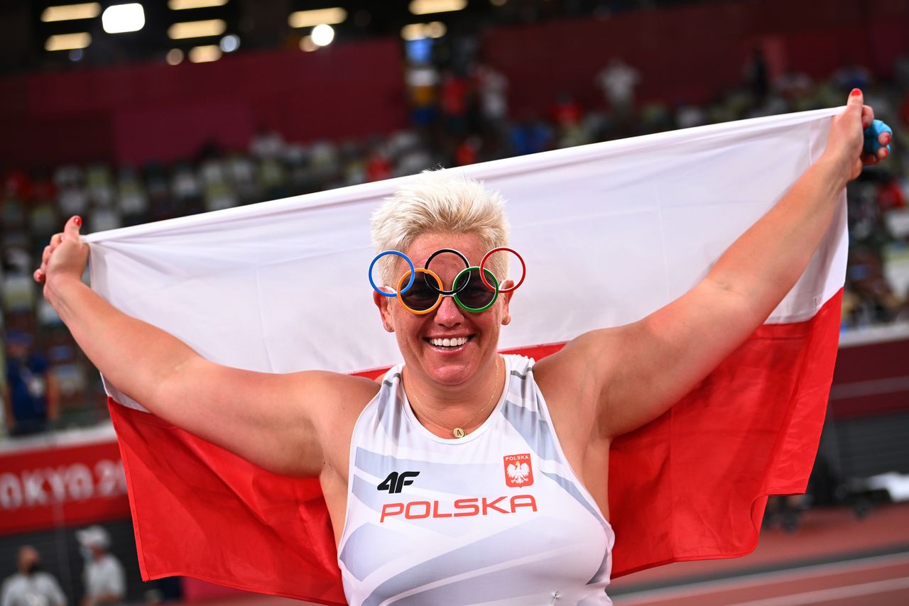 البولندية أنيتا فودارتشيك ترفع علم بلادها بعد الفوز بذهبية الإطاحة بالطرقة في اولبياد طوكيو يوم الثلاثاء. رويترز