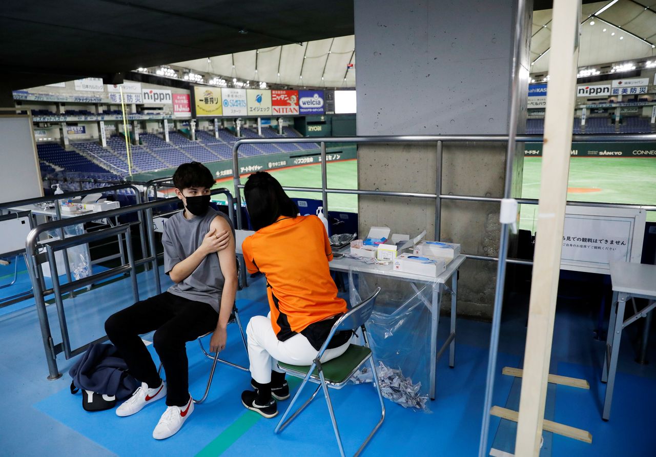 رجل يتلقى جرعة من لقاح فيروس كورونا في طوكيو دوم، موطن فريق البيسبول الياباني المحترف يوميوري جاينتس والذي يستخدم كمركز للتطعيم ضد مرض فيروس كورونا في طوكيو، اليابان في 16 أغسطس/ آب 2021. رويترز / إيسى كاتو.