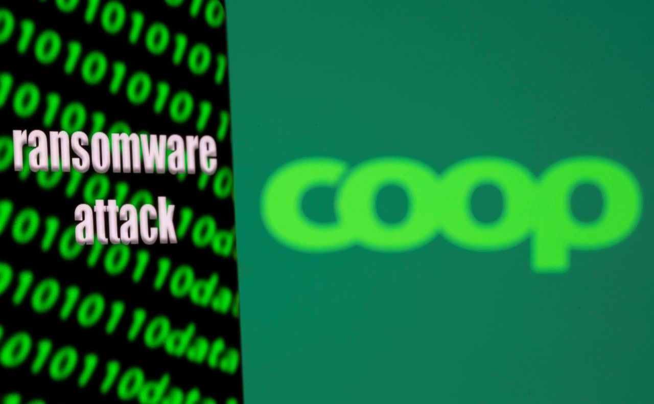 هاتف ذكي كُتب عليه "هجوم برنامج الفدية" وكود ثنائي أما شعار كووب في صورة التقطت يوم السادس من يوليو تموز 2021. تصوير: دادو روفيتش - رويترز