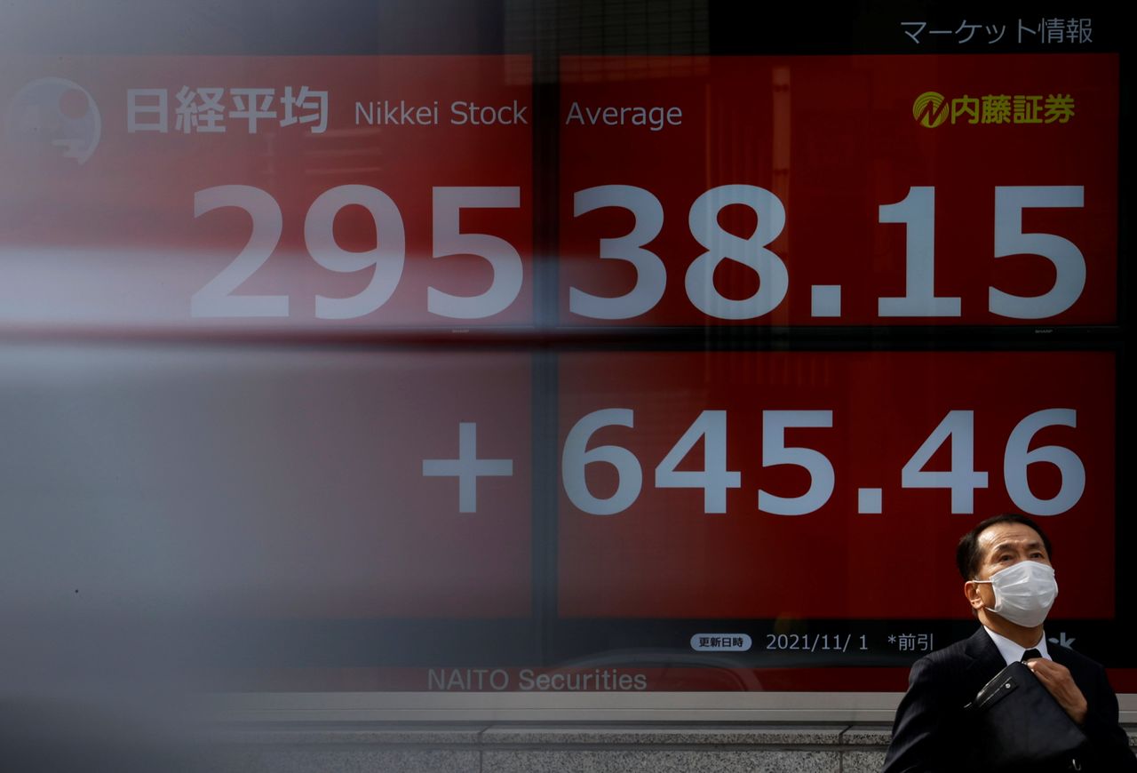 شاشة إلكترونية تعرض متوسط المؤشر نيكي للأسهم اليابانية خارج مكتب للسمسرة في طوكيو يوم 1 نوفمبر تشرين الثاني 2021. تصوير: إيسي كاتو - رويترز.