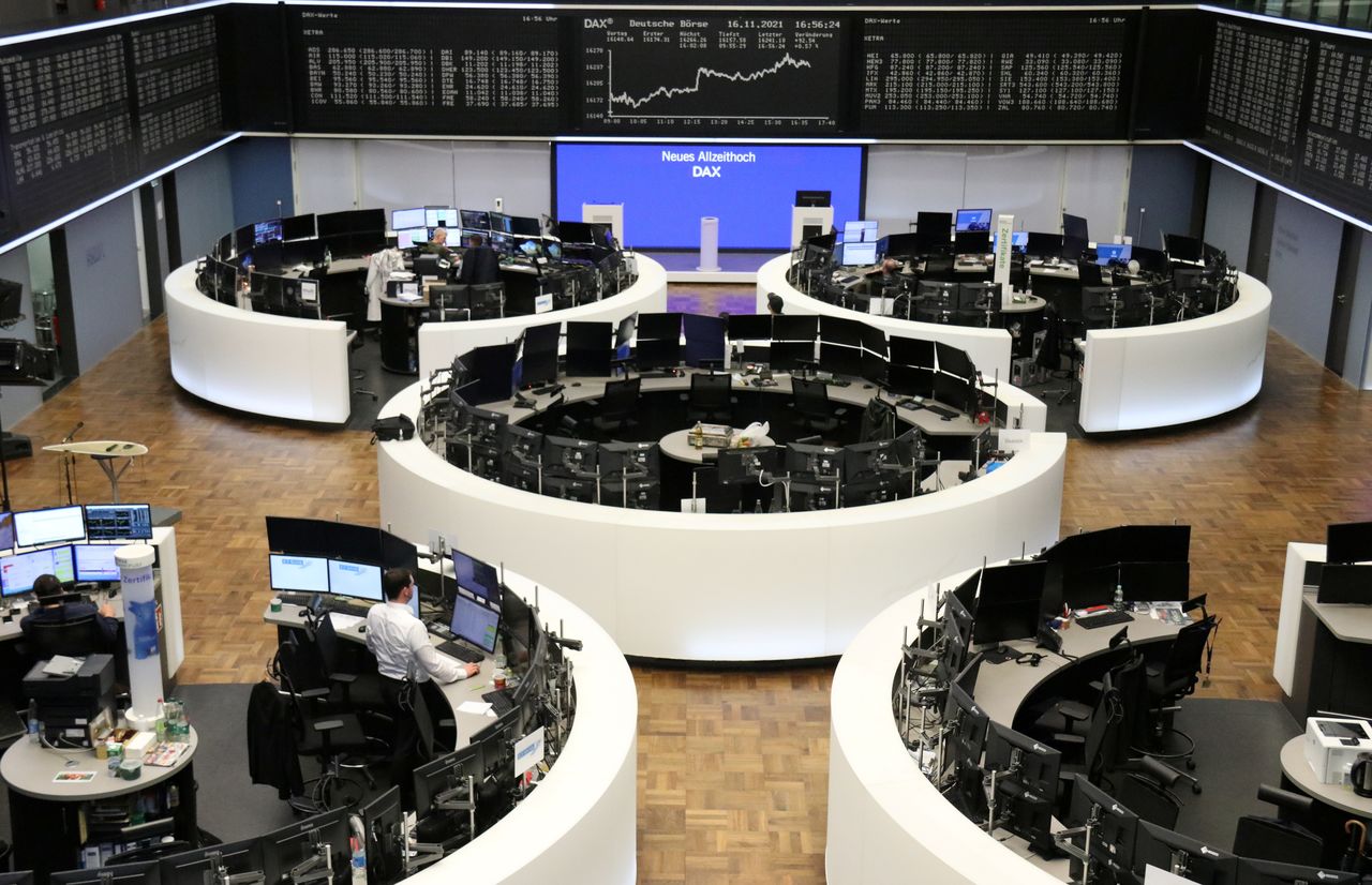 شاشة تعرض حركة المؤشر داكس الألماني في بورصة فرانكفورت يوم 16 نوفمبر تشرين الثاني 2021. تصوير: رويترز.