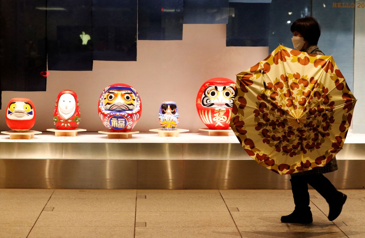 امرأة ترتدي قناعًا واقيًا للوجه، وسط تفشي فيروس كورونا تمر أمام نافذة عرض لمتجر متعدد الأقسام في طوكيو، اليابان، 11 يناير/ كانون الثاني 2022. رويترز / كيم كيونغ هون.