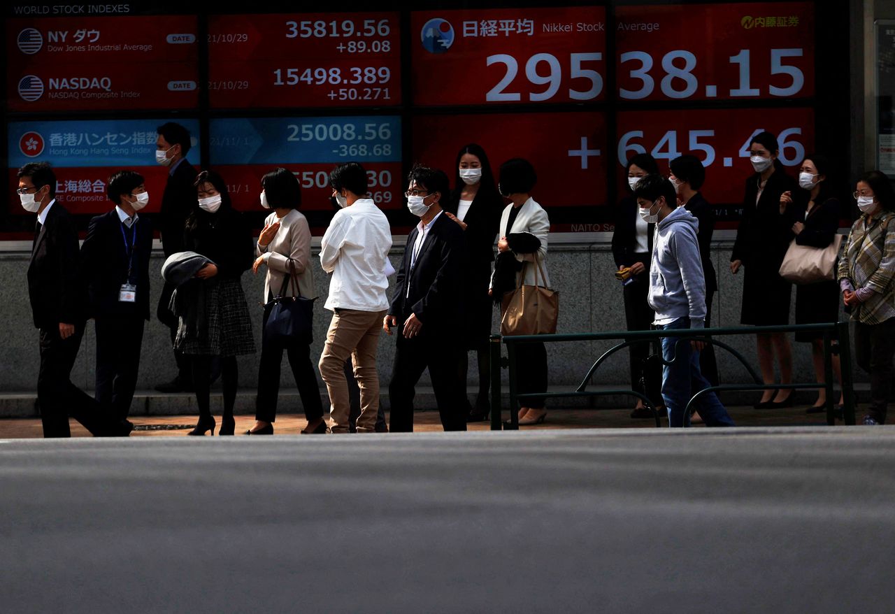 أشخاص يضعون كمامات يمرون أمام شاشة إلكترونية تعرض مؤشر نيكي في طوكيو في الأول من نوفمبر تشرين الثاني 2021. تصوير: إيسي كاتو - رويترز