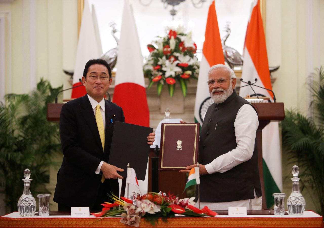 رئيس الوزراء الياباني فوميو كيشيدا ورئيس الوزراء الهندي ناريندرا مودي في صورة بعد توقيع اتفاقية في مقر الحكومة الهندية في نيودلهي يوم السبت. تصوير: عدنان العبيدي - رويترز.