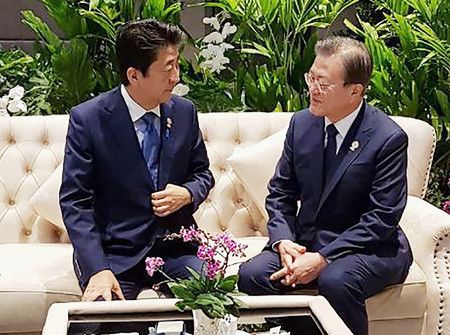وأظهر هذا الموقف في اجتماع ثنائي مع رئيس كوريا الجنوبية مون جيه-إن في إحدى ضواحي بانكوك، في وقت تدهورت فيه العلاقات بين طوكيو وسيؤول بشكل كبير بسبب مجموعة من القضايا المعقدة بينهما. كان اجتماع أبي ومون هو الأول منذ اجتماعهما في بابوا غينيا الجديدة في نوفمبر/ تشرين الثاني 2018 على هامش قمة منتدى التعاون الاقتصادي لآسيا والمحيط الهادئ.