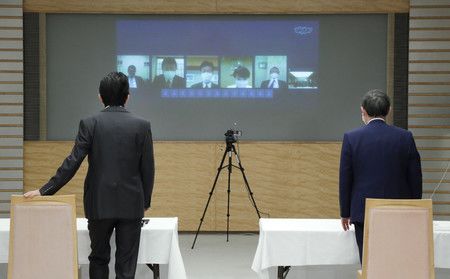 في مكتب رئيس الوزراء، جلس آبي وسوغا بعيدًا عن بعضهما أمام شاشة كبيرة. ظهرت وجوه الأعضاء المتحدثين على الشاشة أثناء الاجتماع.