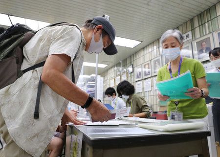 أقام مكتب حي شيناغاوا في طوكيو كشكًا مؤقتًا لتلقي طلبات الحصول على جواز سفر كورونا. اصطف حوالي 10 أشخاص في الكشك وسلموا المستندات اللازمة للموظف المسؤول.