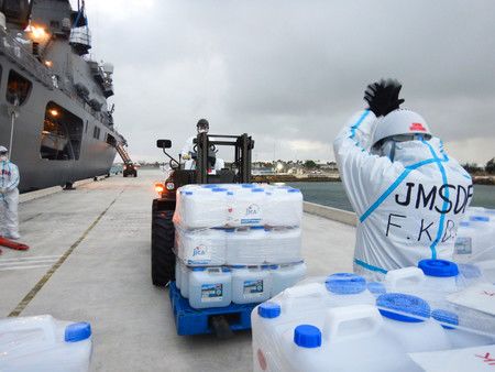 في 24 يناير/ كانون الثاني غادرت السفينة اليابانية قاعدة كوري في محافظة هيروشيما، غرب اليابان، تحمل على متنها رشاشات مياه عالية الضغط لإزالة الرماد البركاني وعربات اليد ومياه الشرب وغيرها من السلع.