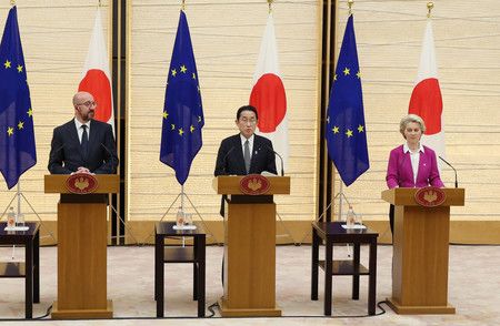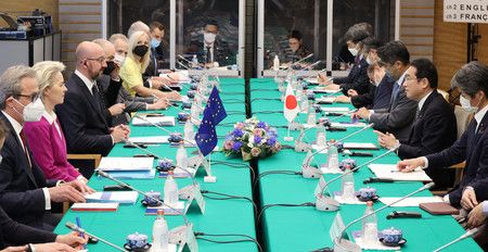 في اجتماع عقد في مكتب رئيس الوزراء في طوكيو، اتفق كيشيدا وزعماء الاتحاد الأوروبي - رئيس المجلس الأوروبي تشارلز ميشيل ورئيسة المفوضية الأوروبية أورسولا فون دير لاين - على أهمية تحقيق منطقة المحيطين الهندي والهادئ الحرة والمفتوحة، على ما يبدو مع الأخذ في الاعتبار الصين، التي تكثف أنشطة الهيمنة.