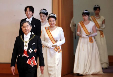 طوكيو - (جيجي برس)-- استقبل الإمبراطور الياباني ناروهيتو والإمبراطورة ماساكو تحيات العام الجديد من أفراد العائلة الإمبراطورية وزعماء البلاد، بما في ذلك رئيس الوزراء إيشيبا شيغيرو، خلال حفل رسمي أقيم في القصر الإمبراطوري بطوكيو صباح الأربعاء.