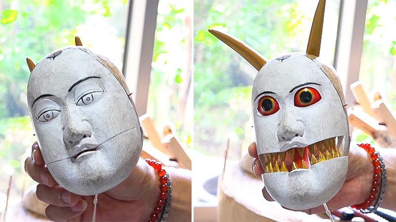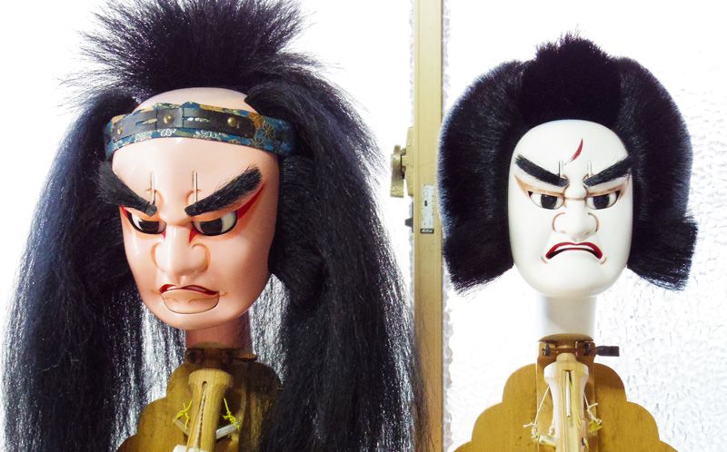 رأس دمية تستخدم في مسرح أوا نينغيو جوروري (يسار) ومسرح بونراكو (يمين).
