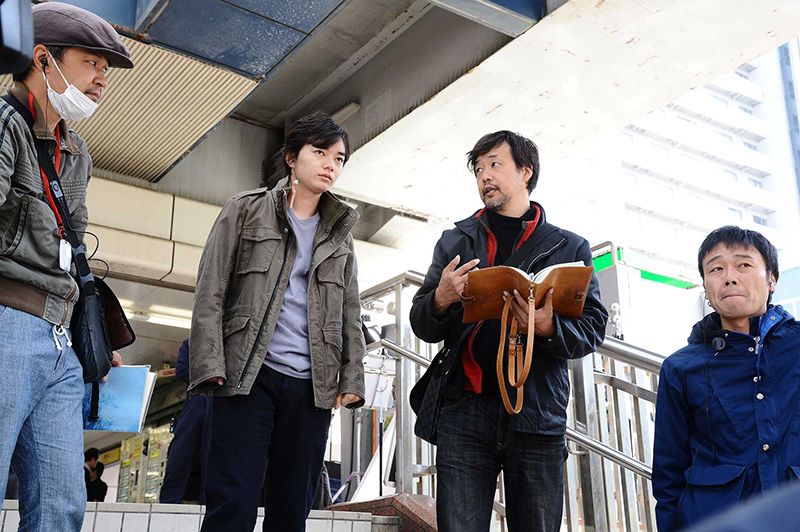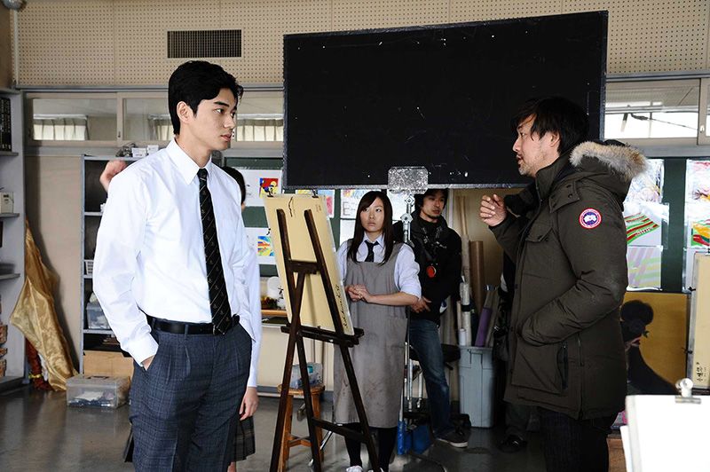 سوميتاني شوتا (الثاني من اليسار)، الذي يلعب بطل الرواية إيزومي شينئيتشي، هو ممثل موهوب فاز بجائزة مارسيلو ماستروياني لأفضل ممثل شاب جديد في مهرجان البندقية السينمائي عام ٢٠١١. (© ٢٠١٥ لجنة إنتاج فيلم كيسيجو).