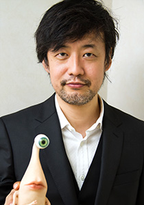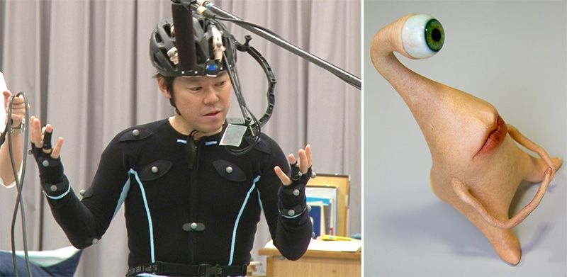آبي ساداؤ، وهو يرتدي بدلة التقاط الحركة، يلعب دور كائن حي يسمى ميغي يصيب يد شينئيتشي اليمنى. (© ٢٠١٥ لجنة إنتاج فيلم كيسيجو).