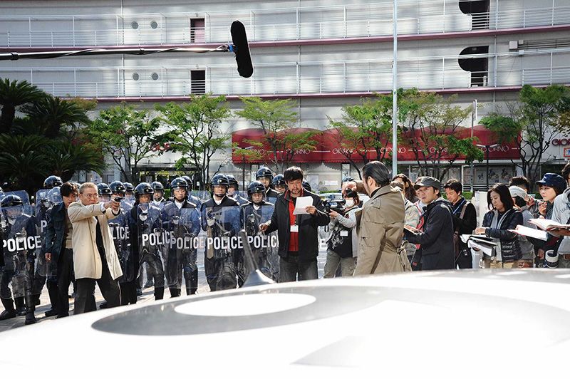 يخرج يامازاكي المواجهة بين البطل الخصم الذي تسيطر عليه طفيلي ووحدة من القوات الخاصة. (© ٢٠١٥ لجنة إنتاج فيلم كيسيجو).