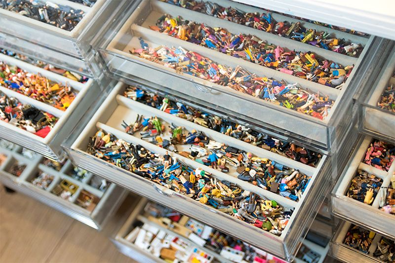 يحفظ تاناكا المجسمات المنمنمة مرتبة حسب الحجم والوظيفة من بين عناصر أخرى.
