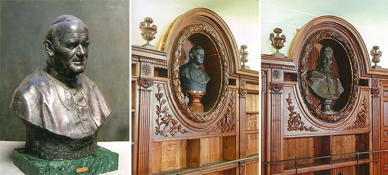 التمثال النصفي من عمل أوكومورا، الخاص بالبابا يوحنا بول الثاني (على اليسار)، بطول حوالي 75 سم (الصورة من أوكومورا نوبويوكي). والتمثال موجود في وسط غرفة باربيريني بمكتبة الفاتيكان في مقابلة تمثال نصفي للبابا أوربان الثامن، على اليمين من صنع بيرنيني. (الصورة من أوكومورا نوبويوكي)