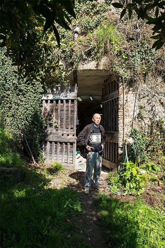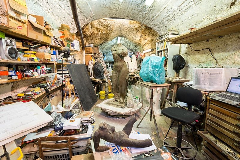 استديو أوكومورا، مبني في كهف تم تعديله. يقول الفنان إن هذه الأجواء مثالية للنحات نظراً لصعوبة العمل.