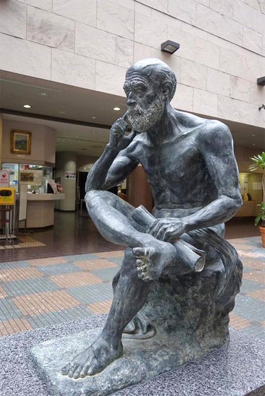 تمثال أبقراط المفكر الموجود في المنشأة الثقافية كوزماتيه يوكوهاشي في يوكوهاشي، فوكوؤكا (الصورة من أوكومورا نوبويوكي)