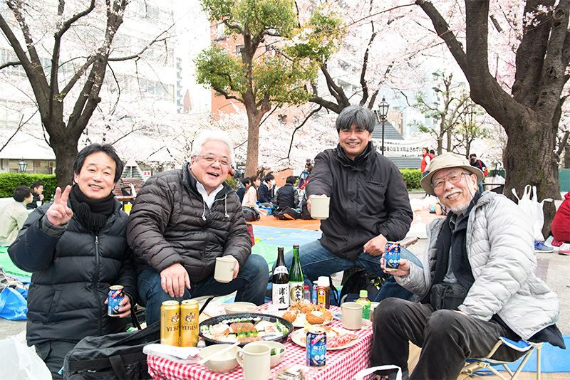 ثم تحدثنا مع مجموعة من المتقاعدين الذين تمكنوا من اعتلاء مكان مثالي لمشاهدة الكرز وبرج طوكيو Skytree في نفس الوقت. هم أصحاب كانوا يعملون في مجال الإعلانات والنشر يجتمعون كل عام من أجل الهانامي. والطبق الرئيسي على مفرش المائدة هو السوشي حيث تم التوصية عليه مسبقا من أحد محلات السوشي في المتاجر، وهذا واضح حيث تبدو المأكولات البحرية المستخدمة في تحضيره ذات مستوى عالٍ من الجودة ولذيذة أيضا. كما جلبوا كذلك سلطة سمك السلمون المدخن، وبعض المخللات والدجاج المقلي، وغيرها من الأطباق الجانبية.