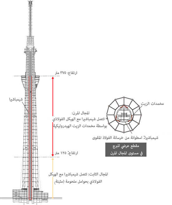 كما يتضمن ”برج طوكيو سكاي تري“ فائق العصرية جانباً تقيليدياً والمتمثل ”بشيمباشيرا“ وهي الدعامة الأساسية الموجودة في معبد ”الباغودا“ الكلاسيكي ذي الطوابق الخمسة. فمنذ سالف العصور اعتمدت تلك المعابد الخشبية والصلبة بشكل يدعو للدهشة على ”شيمباشيرا“ لامتصاص تأثير الزلازل الأرضية وبالتالي لإبقائها منتصبة في السماء.
