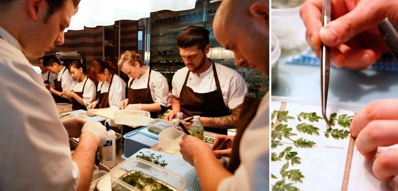وما أن دخلنا المطبخ، حيث كان جبل فوجي المُغطى بالثلوج واضح الرؤية، أخرج نائب رئيس الطهاة بو كلوغستون من الثلاجة ثَمَرة كيوي برية نضجت في إحدى مزارع ناغانو. وقال: ”هل تريدون تذوق واحدة منها ؟“ وبينما كانت تلك الفاكهة تُرَطِبُ لسان متذوقها، فإنها أضفت نُكهةً غنية أيضا لا سيما أن كامت ممزوجة عند تناولها للتو مع مذاق الحموضة وعلى مقربة من المدخل، كان الطهاة الشباب يفتحون المحار في المياه العذبة وعلى نحو الواحدة تلو الأخرى ويرتبون أوراق السانشو (فاغرة فلفلية) المملحة ويكسرون الجوز. وكان المطبخ أشبه بالمتاهة، حيث ينقسم إلى عدة غرف، بما في ذلك مطبخ الإعداد والتحضير الواقع في القَبوِ الثالث تحت الأرض من نفس المبنى أي تحت أربعين طابقا حيث يُقال. ”إذا نسي أحدهم النمل، فعليه انتظار المصعد والذهاب لجلب النمل، وانتظار المصعد مرة أخرى والعودة للمطبخ“، هذا ما يوضحه أنطوني كوستا، المدير العام للفندق، في إشارة إلى واحدة من مكونات المطعم الأكثر غرابة.