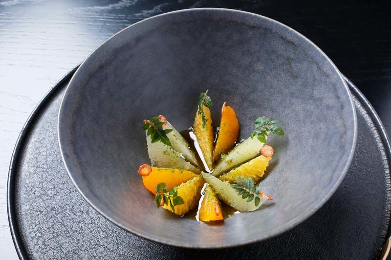 حمضيات وفلفل طويل: أربعة أنواع من الحمضيات - هسّاكو وبرتقال ميكان، بونتان وبوميلو - مقطعة ومقدمة مثل الساشيمي، ومزينة بأوراق السانشو المملحة، الفلفل الطويل والملح بنكهة الصنوبر، وزيت ريشيري كومبو.