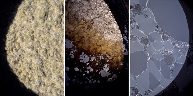 من اليسار إلى اليمين: بعد مرور شهر، تشير الفقاعات على السطح إلى أن التخمر اكتمل على أتم وجه. وبعد ثلاثة أشهر، يستمر تخمر حمض الأسيتيك وتغوص الطبقة السطحية لفطر (كوجي كن) إلى القاع. وبحلول الشهر الرابع، تتكون طبقة رقيقة من بكتيريا حمض الأسيتيك وعندما تختفي يتم الانتهاء من عملية التخمير الأولية.