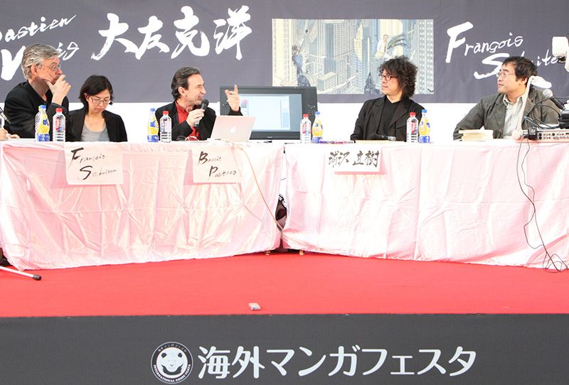 من اليسار: شوتين و بيترز مع مترجمتهما التي تجلس بينهما، أوراساوا، ومترجم القصص المصورة الأوروبية هارا ماساتو الذي ترأّس جلسة النقاش.