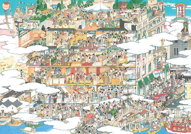 كوياما : هذا العمل استخدمت فيه أسلوب ”فوكينوكي ياتاي“ الذي ظهر في منتصف عصر ”هييان“، أليس كذلك؟ ولعله هو أسلوب تختصر فيه السقوف مستعرضاً المنظر العام كما لو كنا نراه من أعلى. وقد رسمت متجر ميتسوكوشي عارضاً الناس المتجهين للمتجر والحركة داخل المتجر. كما لو كان الناس من عصور مختلفة تماماً عن عصر الموموياما والإيدو والعصر الحاضر مجتمعين، يأكلون ويتسوقون معا أمام أعيننا.