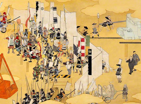 معركة عصرية سخيفة/ ١٩٩٩/ زيتي على الخيش/٩٧×٣٢٤ سم/ تصوير: ميازيما كي/ مجموعة تاكاهاشي/ © ياماغوتشي أكيرا، مقدمة من معرض ميزوما الفني.