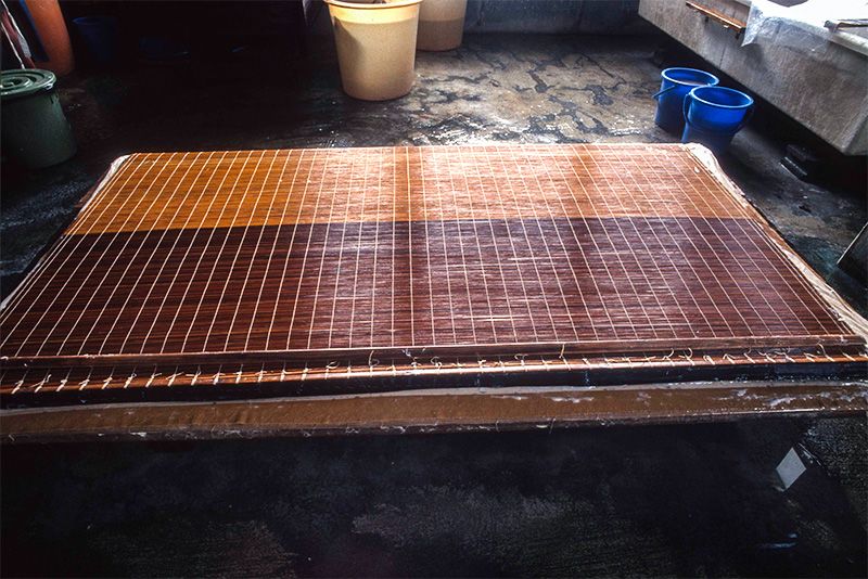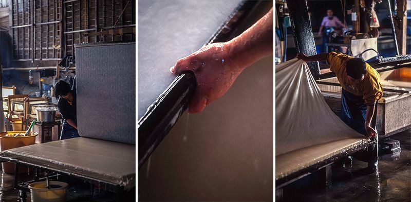 يتم إخراجها من الألواح المخصصة لفرد الورق الياباني، ورصها رأسيًا واحدة تلو الأخرى (إلى اليسار). يتم فرد الورق على ألواح ذات إطار، والعمل عليها بسمك موحد بعد القيام بحركة هز خفيفة (في المنتصف). طرق الصنع التقليدية تتم بالمياه في فصول البرد ( إلى اليمين).