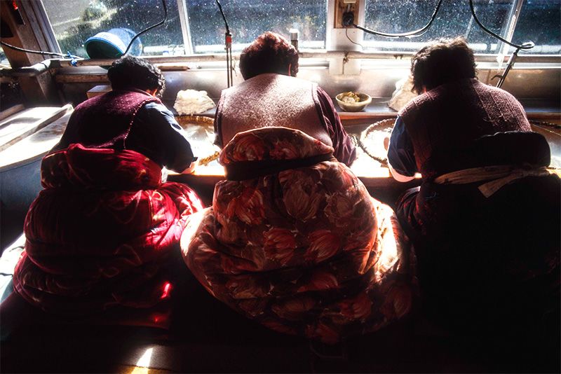 سيدات أثناء العمل على إزالة الشوائب. لا تنفك أيديهن عن المياه الباردة. تنكبَّ السيدات على العمل بهذه الشكل الذي يساعدهن على عدم برودة الأرجل ومنطقة الخصر.