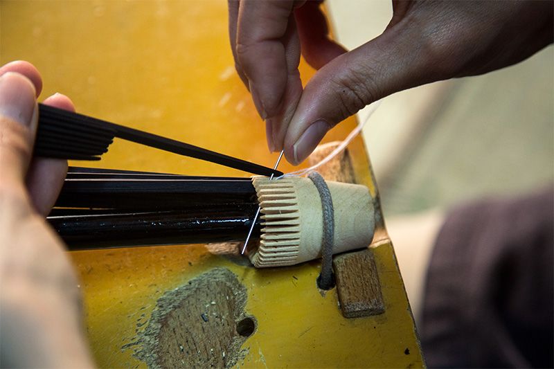 مجرد سماع ذلك يجعلك تشعر باليأس، ولكن يبدو أن هناك طريقة سرية. حدقنا جيدا بيدي صانع الأعواد من أجل معرفة طريقة صنعها. وعرفنا أنه يتم رسم خطوط مستقيمة باستخدام مسمار على الجانب الخارجي من أنبوب الخيزران قبل تقطيعه. فقط مجرد ذلك. وإذا تم ترتيب الأعواد بحيث تصبح تلك الخدوش الخطوط الأصلية، ستصبح على شكل أنبوب الخيزران الأصلي. وبعد إدخال تلك الأعواد في قضيب خيزراني نحيف بالترتيب يتم إرسالها إلى ورشة تقوم بربطها ببعضها البعض.