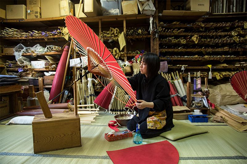 من الصعب القيام بلصق الورق الياباني بشكل مستقيم لأنه يتم لصقه على الجانب الداخلي من أعواد المظلة. سألنا أحد الحرفيين الشباب الذي وقع في حب المظلات اليابانية من النظرة الأولى.