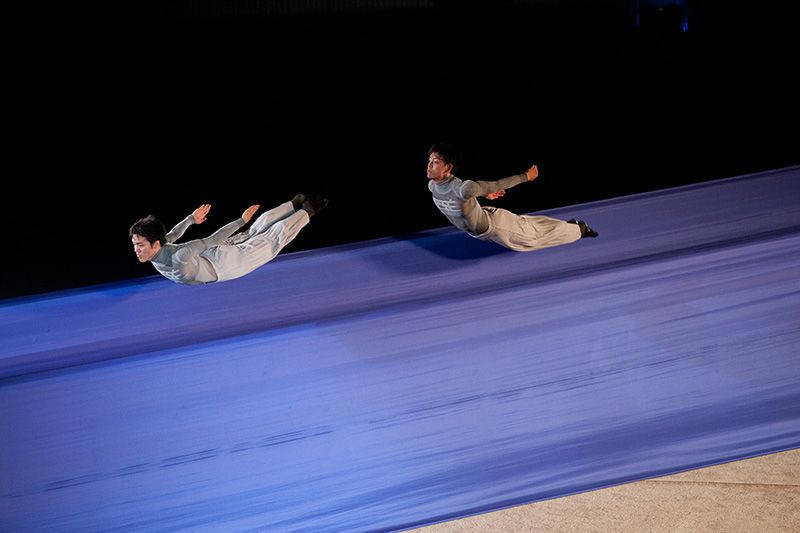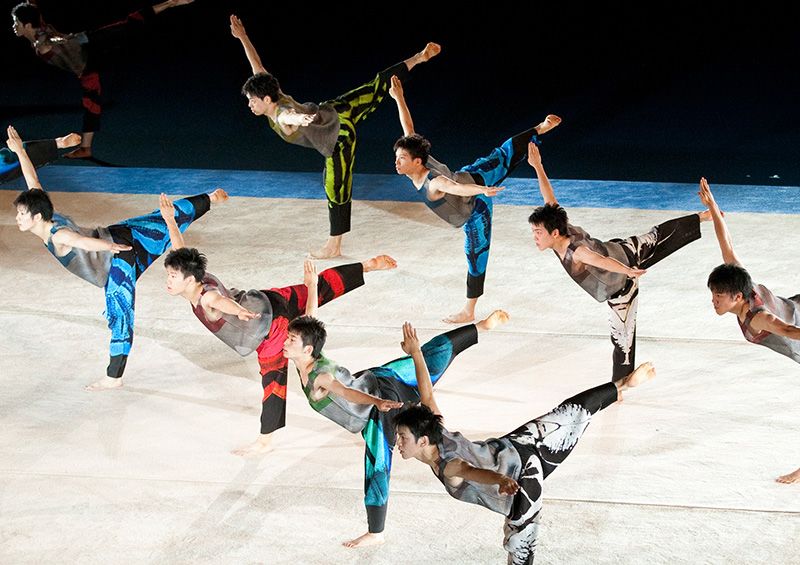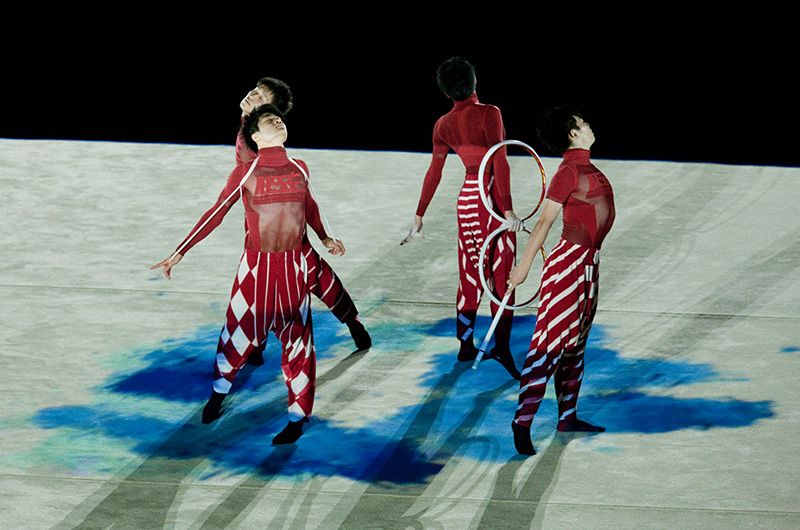 وقد بدأت حشود المعجبين بهذه الرياضة في التراص في طوابير أمام صالة الألعاب الثانية بإستاد يويوجي القومي يوم ١٨ يوليو/ تموز ولعدة ساعات قبل افتتاح العرض وذلك على الرغم من حرارة الجو يومها. وعندما بدأ العرض كانت المدرجات قد امتلأت عن أخرها أي حوالي ٢٩٠٠ فرد وهى نسبة تفوق بـ ٢٠ مرة العدد الذي كان يتوقع حضوره. وعلى الرغم من عدم شهرة العرض وقتها إلا أنه لاقى تشجيع حار وقد حبس الجمهور أنفاسه مع البداية الرائعة الخيالية. ولمع القماش الأزرق الذي يكسو الأرضية في المنتصف بقطر ٣٠ يناهز متراً مع إضاءة ضئيلة في محيط الظلام الذي غطى القاعة. تأخذ اللاعبون بتحريك القماش على شكل أمواج خفاّقة، وما أن تكورت في شكل قطرة ماء حتى فردوها تماما كسطح البحر. وبعدها بقليل ظهر اللاعبون مثل نشوء الحياة الأولية من البحر، وتحول العرض تدريجياً من الهدوء إلى الحركة. وانسابت مشاهد اللاعبين الذين أخذوا يقفذون في الأرضية المستديرة بالقاعة كما لو كانوا أسماكاً ودلافيناً تقفز وتعوم في مياه البحر كما قال السيد إيزرالو.