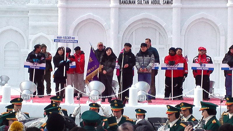 بدأ حفل الإفتتاح للمنافسات يوم ٤ فبراير/شباط ٢٠١٤ باداء الفرقة الموسيقية لقوات الدفاع الذاتي على الآلات النحاسية. وعلى الرغم من البرد القارس الذي تتميز به الأجواء في تلك المنطقة في هذا الوقت من السنة، فقد دخلت الفرق المشاركة والسعادة بادية على وجوهها المبتسمة والمشرقة. يقول السيد هوشينو رئيس اللجنة التنفيذية في الكلمة الإفتتاحية: ”إن نحت المجسمات والتماثيل في هذا البرد القارس والثلوج الكثيفة أمر شاق. أتمنى ان تتنبهوا جيداً لأنفسكم“. ثم بعد ذلك قام فريق تايلاند الذي توج باللقب في العام الماضي بإعادة علم المسابقة، وتقدم ممثل الفريق ليلقي كلمة التحية وقال: ”أتعهد بأننا سوف ننافس بقوة على اللقب، كما أتعهد بتوسيع دائرة الصداقة والمحبة“. أعقب ذلك تصفيق حار من المشاهدين الذين ملؤوا المكان.