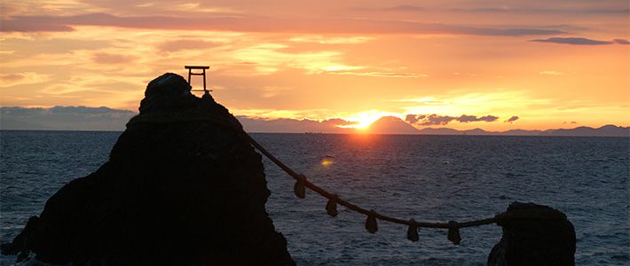 (نشر النص الأصلي باللغة اليابانية في ٧ نوفمبر/ تشرين الثاني ٢٠١٦. صورة العنوان: الشمس تشرق بجانب جبل فوجي كما هو المنظر من فوتاميغاورا في إيسي، بمحافظة ميه، في وقت قريب من انقلاب الشمس في الصيف. نور الفجر الذي يسطع بين الصخرتين المقدستين في هذا المكان كان يعبد منذ العصور القديمة، باعتباره ”هي“ الطاقة الإلهية).