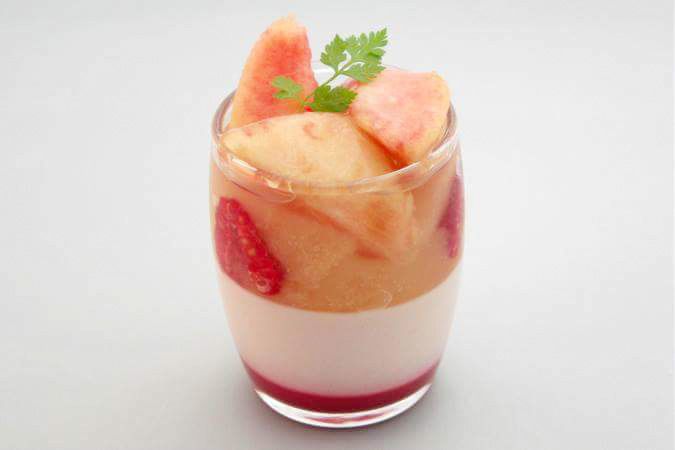 حلوى ”دراق ميلبا“ من متجر الحلويات في طوكيو Anniversary، التي تضم دراق فوروياما. الحلوى، التي تعاون فوروياما على تصميمها، هي طهو حريري على نحو سلس لقشدة الدراق المخفوقة وجيلاتيه التوت المغطاة بالدراق الطازج. الصورة من Anniversary Co., Ltd.
