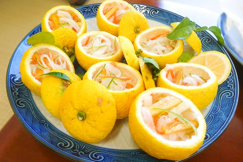 ”يوزو“ هي فاكهة يابانية من الحمضيات لديها رائحة فريدة تختلف عن كلٍ من الليمون واللّيم والجريب فروت. نكهة ثمرة اليوزو التي تدخل في أطباق المخللات والشوربات في المطبخ الياباني كخلطة الدُّقة الأصلية في المطبخ العربي التي تحبُك المذاق وتغنيه، كما أن مذاق هذه الفاكهة المميز في حلوى المثلجات يجدد المزاج ويعطي انتعاشة خاصة. ولا يتوقف سحر فاكهة اليوزو في الطعام فحسب بل لها تأثير أيضاً في تدفئة الجسم البارد شتاءً، فهي تُجدد خلايا الجسم وتنعشه، ولذلك فقد كانت توضع ثمرات اليوزو منذ القدم في مغطس الحمّامات الساخنة خاصةً في يوم الإنقلاب الشتوي فيما يعرف بـ”يوزو- يو“ أي ”حمّام اليوزو الساخن“. إذا جربته مرة لن تنساه أبداً.