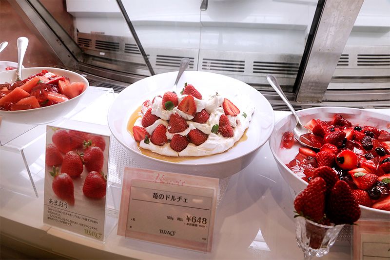 إن حلوى بارفيه الفراولة في متجر تاكانو والتي تقدم في كأس طويلة مفضلة بشدة لدى الزبائن وهي طبق الفاكهة المميز في قائمة الطعام الموسمية للمتجر على مدى أربع أشهر كاملة من العام. وتكون حلوى البارفيه المصنوعة من طبقات من المثلجات والكريمة المخفوقة وقطع من فراولة ساكورامومو وهلام الفراولة وعلى وجهها أوراق النعناع، مشهية للعين والمعدة.