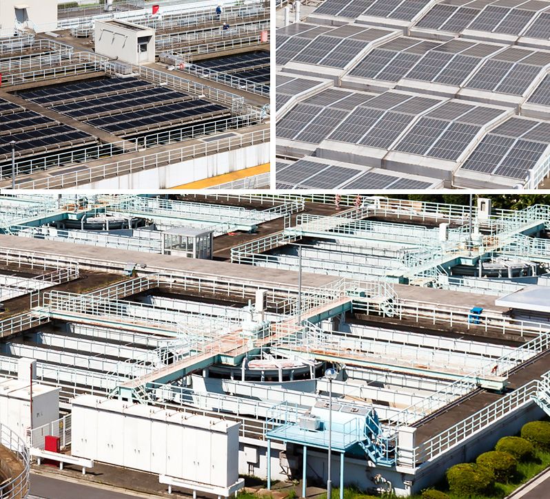(من أعلى اليسار باتجاه عقارب الساعة) أحواض الترسيب المنحدرة التي تُزيل بفعالية موادا صلبة عالقة بالمياه الخام. وتغطي الألواح الشمسية بُرَك الترشيح بالرمال التي هي الخطوة الأخيرة في المعالجة المتقدمة للمياه وكذلك تسوية الأحواض وغيرها من المرافق لمعالجة المياه الصناعية في محطة ميسونو.