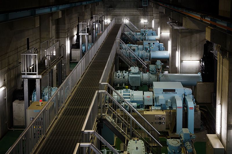 صف من المضخات في محطة ميسونو. وتقع محطة ضخ مماثلة في نقاط استراتيجية للحفاظ على ضغط المياه على مستوى ثابت في جميع أنحاء منطقة العاصمة.