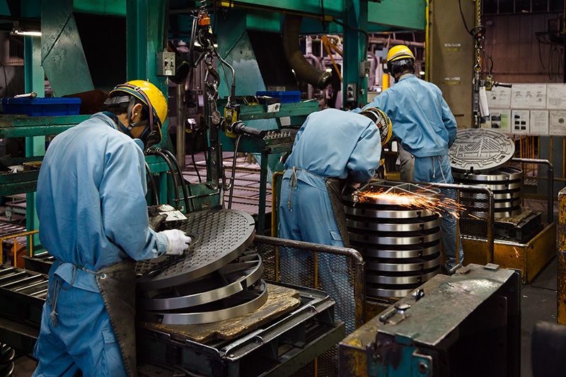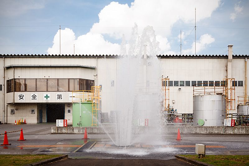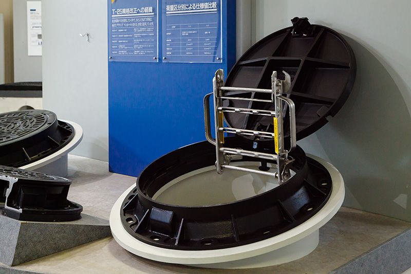 مصنع توتشيغي لمعدات إمدادات المياه في هينودِه. فعلى خلاف أغطية الصرف الصحي، يتم تصنيع وتطوير المعدات المتنوعة المتعلقة بأنابيب المياه تحت وفوق سطح الأرض.