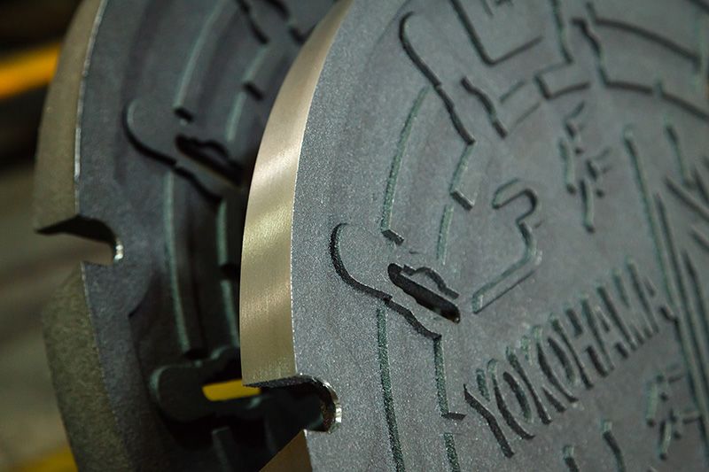 القالب الأم المصنوع من الألومنيوم. هذا هو الشكل الأصلي لأغطية الأغطية الصرف الصحي. الصورة تعود إلى مدينة يوكوهاما التي تم تصميم جسر باي بها.