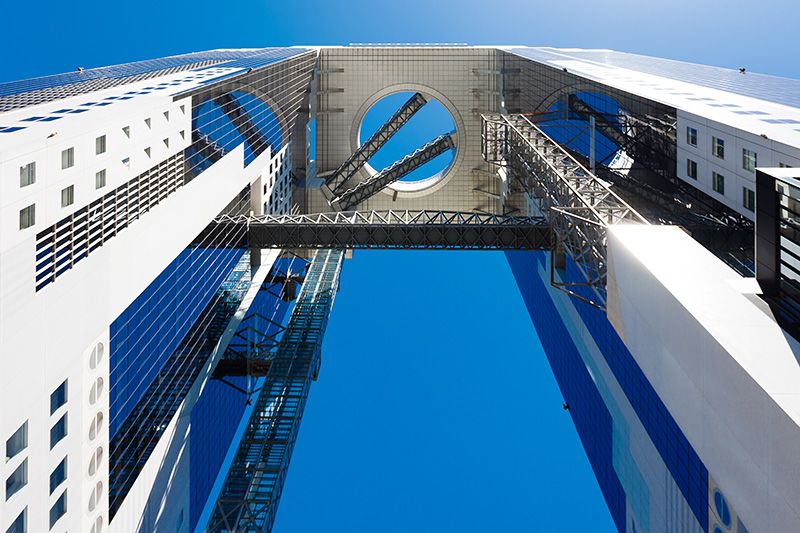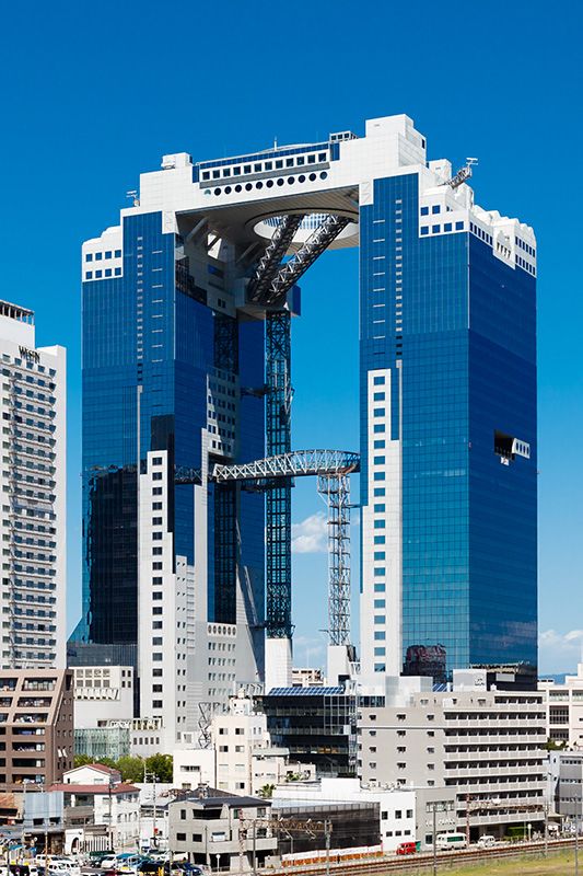 يتكون أوميدا سكاي بيلدينغ، رمز معماري لمدينة أوساكا، من ناطحتي سحاب ذاتا ٤٠ طابقا، متصلتين من أعلى ببناء يعرف بمرصد الحديقة المعلقة. تم تجميع المرصد بشكل موسع على الأرض قبل أن يتم حمله لارتفاع ١٧٣ متر وتثبيته في مكانه، في عملية إنشائية رائدة. ليكتمل تشييد المبنى عام ١٩٩٣ بعد إتمام ذلك العمل الهندسي.