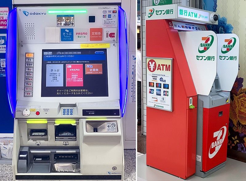 ماكينة الصراف الآلي (يمين)، ماكينة شراء التذاكر وشحن بطاقات القطارات في اليابان.
